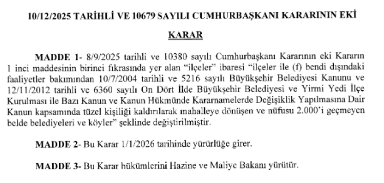 Kararın 1. maddesinin birinci fıkrasında yer alan “ilçeler” ibaresi, “ilçeler ile (f) bendi dışındaki faaliyetler bakımından 10/7/2004 tarihli ve 5216 sayılı Büyükşehir Belediyesi Kanunu ve 12/11/2012 tarihli ve 6360 sayılı On Dört İlde Büyükşehir Belediyesi ve Yirmi Yedi İlçe Kurulması ile Bazı Kanun ve Kanun Hükmünde Kararnamelerde Değişiklik Yapılmasına Dair Kanun kapsamında tüzel kişiliği kaldırılarak mahalleye dönüşen ve nüfusu 2.000’i geçmeyen belde belediyeleri ve köyler.” olarak değiştirildi.