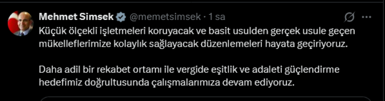 1 Ocak 2026 tarihinden itibaren geçerli olacak kararla ilgili Hazine ve Maliye Bakanı Mehmet Şimşek de, sosyal medya hesabından yaptığı paylaşımda, “Küçük ölçekli işletmeleri koruyacak ve basit usulden gerçek usule geçen mükelleflerimize kolaylık sağlayacak düzenlemeleri hayata geçiriyoruz. Daha adil bir rekabet ortamı ile vergide eşitlik ve adaleti güçlendirme hedefimiz doğrultusunda çalışmalarımıza devam ediyoruz” ifadelerini kullandı.