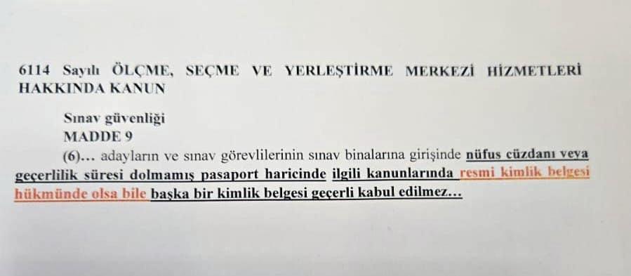 ÖSYM kanununda, nüfus cüzdanı ve pasaport haricinde hiçbir kimlik belgesinin geçerli kabul edilemeyeceği vurgulanıyor.