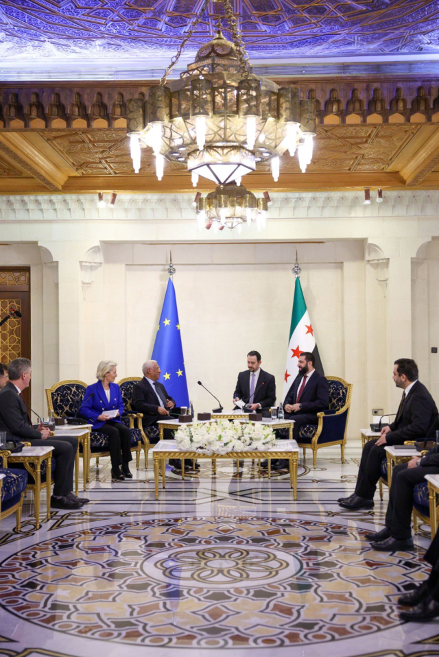 Suriye devlet medyasına göre Avrupa Komisyonu Başkanı Ursula von der Leyen, Şam’a giderek Ahmed Şara ile görüştü. Bu ziyaret, AB’nin Suriye’ye yönelik en üst düzey temaslarından biri olarak nitelendirildi. Görüşmeye Avrupa Konseyi Başkanı Antonio Costa da katıldı.