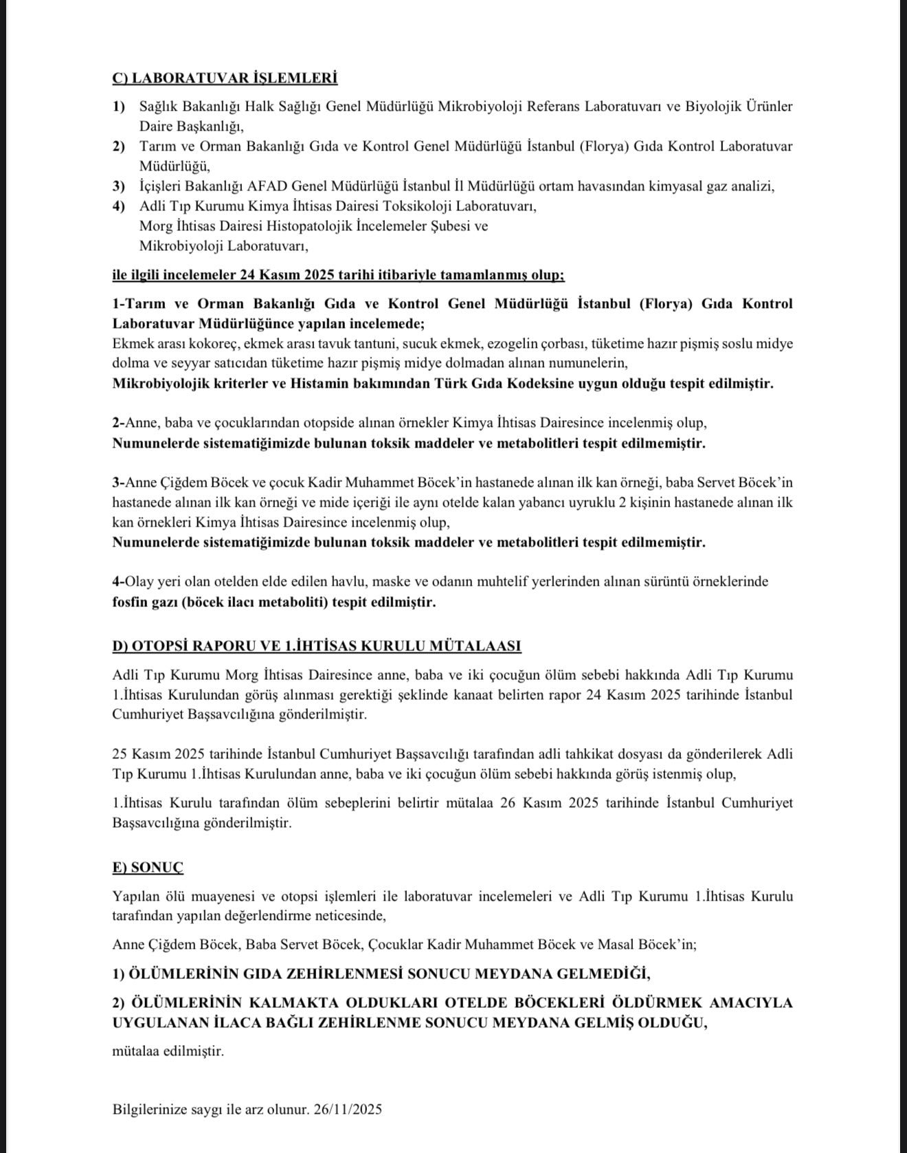 Adli Tıp Kurumunca hazırlanan raporda, ‘Adli Tıp Kurumu Morg İhtisas Dairesince anne, baba ve iki çocuğun ölüm sebebi hakkında Adli Tıp Kurumu 1. İhtisas Kurulu’ndan görüş alınması gerektiği yönünde kanaat belirten rapor, 24 Kasım 2025 tarihinde İstanbul Cumhuriyet Başsavcılığı’na gönderilmiştir. 25 Kasım 2025 tarihinde İstanbul Cumhuriyet Başsavcılığı tarafından adli tahkikat dosyası da gönderilerek Adli Tıp Kurumu 1. İhtisas Kurulu’ndan anne, baba ve iki çocuğun ölüm sebebi hakkında görüş istenmiş olup, 1. İhtisas Kurulu tarafından ölüm sebeplerini belirtir mütalaa 26 Kasım 2025 tarihinde İstanbul Cumhuriyet Başsavcılığı’na gönderilmiştir. Yapılan ölü muayenesi ve otopsi işlemleri ile laboratuvar incelemeleri ve Adli Tıp Kurumu 1. İhtisas Kurulu tarafından yapılan değerlendirme neticesinde; Anne Çiğdem Böcek, baba Servet Böcek, çocuklar Kadir Muhammet Böcek ve Masal Böcek’in; Ölümlerinin gıda zehirlenmesi sonucu meydana gelmediği, Ölümlerinin, kalmakta oldukları otelde böcekleri öldürmek amacıyla uygulanan ilaca bağlı zehirlenme sonucu meydana gelmiş olduğu mütalaa edilmiştir’ yazıldı.