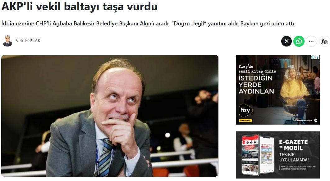 Konuyla ilgili bugün bir haber yayınlayan Sözcü Gazetesi ise “AKP’li vekil baltayı taşa vurdu” başlığıyla servis ettiği haberde CHP’li Veli Ağbaba’nın telefonla Balıkesir Büyükşehir Belediye Başkanı Ahmet Akın’ı arayarak “Doğru mu?” diye sorduğunu Akın’ın ise “Böyle bir şey olmadı, doğru değil” cevabını verdiğini, bu durum üzerine AK Partili Baykan’ın da “Doğru değilse özür dilemesini de biliriz” diye geri adım attığını iddia etmişti.